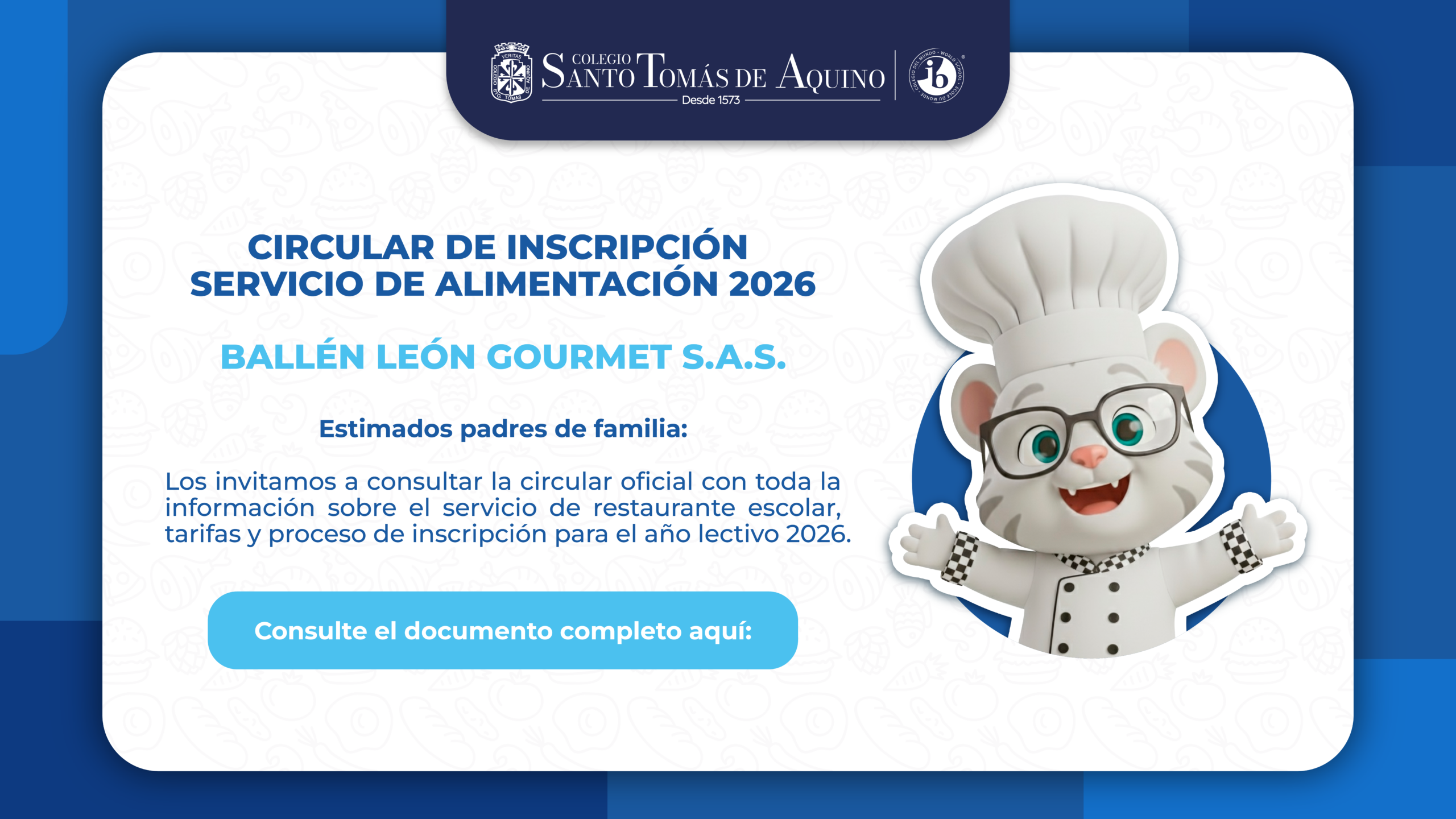 Ponemos a su disposición la circular de inscripción al Servicio de Alimentación 2026, operado por Ballén León Gourmet S.A.S., donde encontrará toda la información relacionada con el restaurante escolar, tarifas y el proceso de inscripción para el año lectivo.